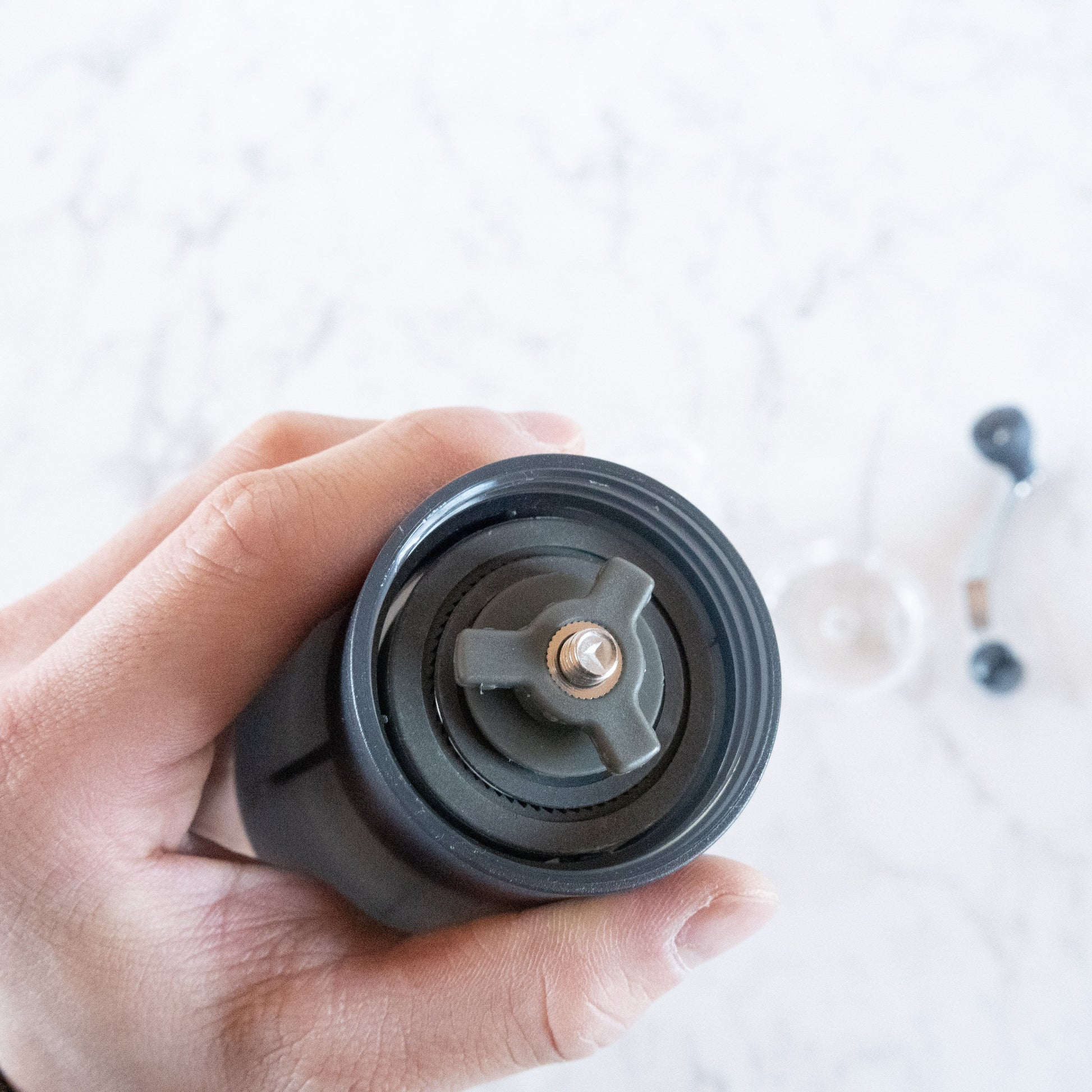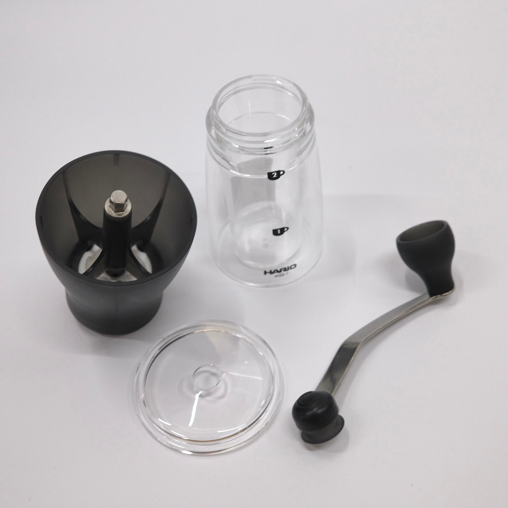 HARIOのコーヒーミル セラミックスリム。すべてのパーツを丸洗いできる、軽量のミル。セラミック製の臼を使用しているため、摩擦熱が発生しにくく、熱によるコーヒー粉へのダメージを防ぎます。ハンドルをはずすとコンパクトに納まるので、持ち運びに便利です。