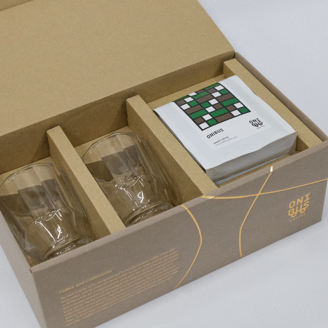 シグネチャーブレンドのオニバスブレンドと、オリジナルグラスのギフトセットです。