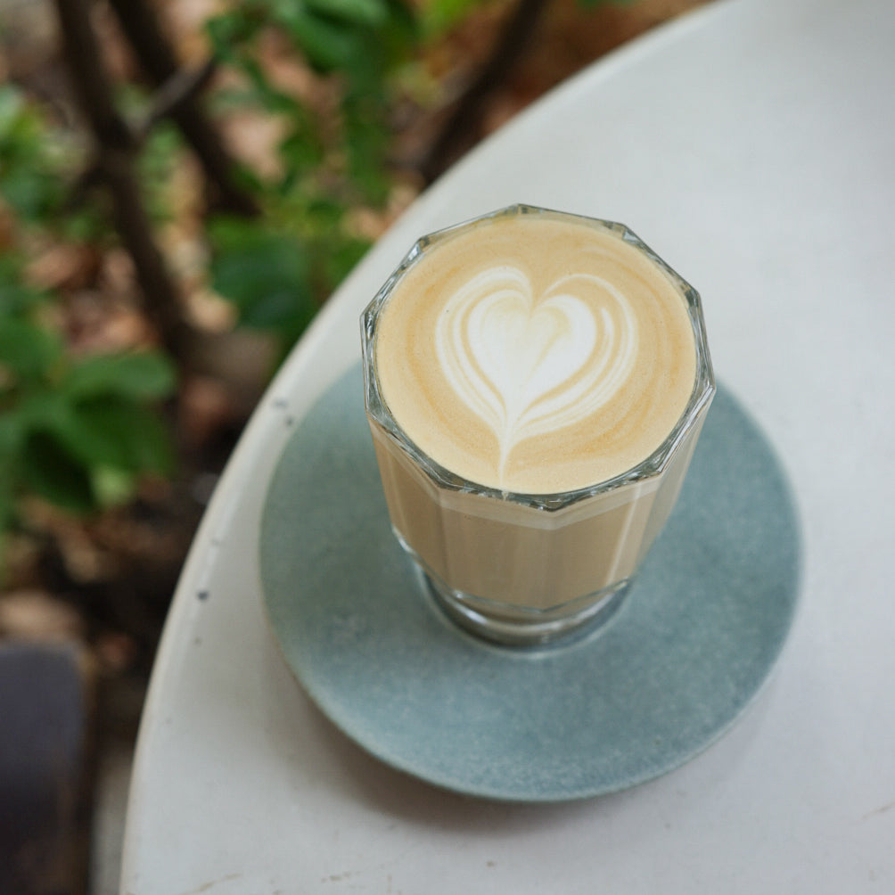 直線的なラインのシルエットが印象的なグラスをペアでご用意。店舗でも使用しているこのグラスは、コーヒーの色味やカフェラテのミルクフォームの層を美しく見せてくれる特別な一品。耐熱ガラスなのでコーヒーはもちろん、様々なシーンで使えます。